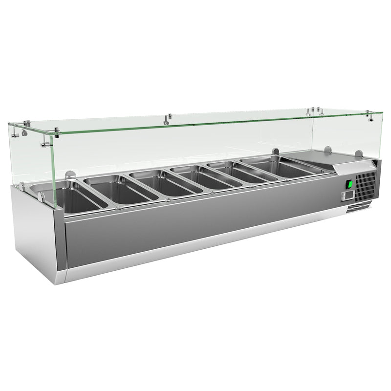 Stacjonarna witryna dla zakładów gastronomicznych. Tryb temperatury +2...+8 ℃. Pojemność GN1/2х1+GN1/3х5. Pojemniki GN i pokrywki do nich nie są częścią zestawu. Sprzęt posiada elektroniczny panel sterowania, chłodzenie statyczne. Witryna ma prostą szybę. Czynnik chłodniczy R290.