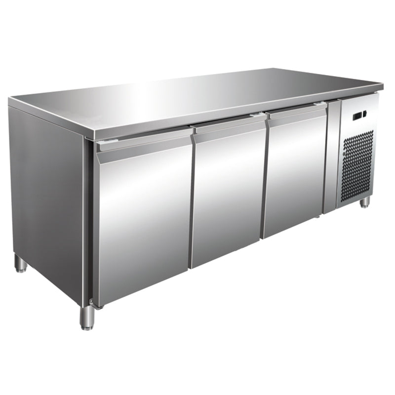 Urządzenie na 3 drzwi. Pojemność - 417 l. 3 półki kratowe 330x430. Temperatura pracy: -2...+8˚С. Funkcja automatycznego odszraniania. Czynnik chłodniczy R290. Dynamiczne chłodzenie, elektroniczny panel sterowania. Wykończenie wewnętrzne i zewnętrzne - stal nierdzewna.