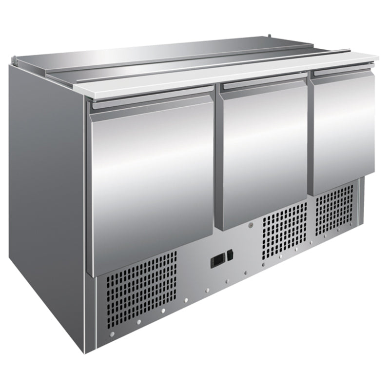 Urządzenie na 3 drzwi bez burtów. Pojemność 400 l. 1 półka druciana GN 1/1 z plastikową pokrywą każdej komorze. Temperatura pracy: +2...+8°С. Wykończenie wewnętrzne i zewnętrzne - stal nierdzewna AISI 201. Czynnik chłodniczy R290. Pojemność komory 4 x GN1/1 o głębokości do 150 mm. Chłodzenie statyczne, elektroniczny panel sterowania.